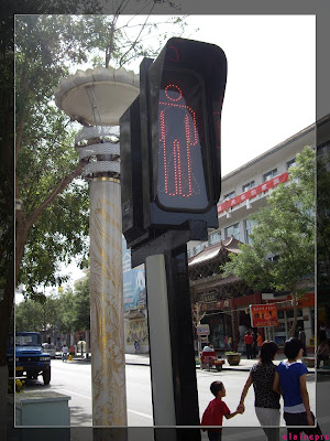 这是敦煌市内的路灯,我超喜欢!可爱的不得了,是会动的,绿灯时就是一个绿色的小人在走路。
