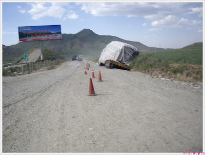 路上的事故。图片左边的小坡坡并不是一条路哦,是一个缓冲带,据说很多大车走这里刹不住车了就会冲上去减速,这个我也是第一次看到,武汉那种平原好像根本不需要这样的设置。